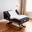 Высота ложа плавно регулируется электроприводом, позволяя без усилий подобрать идеальное положение. В нижнем положении кровать обеспечивает безопасность при использовании, а в верхнем - значительно облегчает уход за лежачими пациентами, а также замену постельного белья, минимизируя нагрузку на спину.