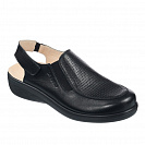 Верх выполнен из натуральной гладкой кожи чёрного цвета, подкладка, также кожаная, обладает мелкой перфорацией, обеспечивающей непрерывный влаго- и теплообмен при ходьбе. Несъёмная ортопедическая стелька с покрытием из натуральной кожи дополнительно амортизирует каждый шаг, оберегает от развития деформационных процессов в ногах.